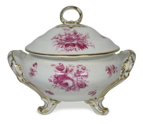 each piece decorated with puce coloured flower sprigs and sprays, within a gilt border, comprising of: five tureens and covers, of various size; a tureen (cover lacking); three stands, of various size; four graduated ashets; 23 dinner plates; 12 soup plates; and three luncheon plates (qty)