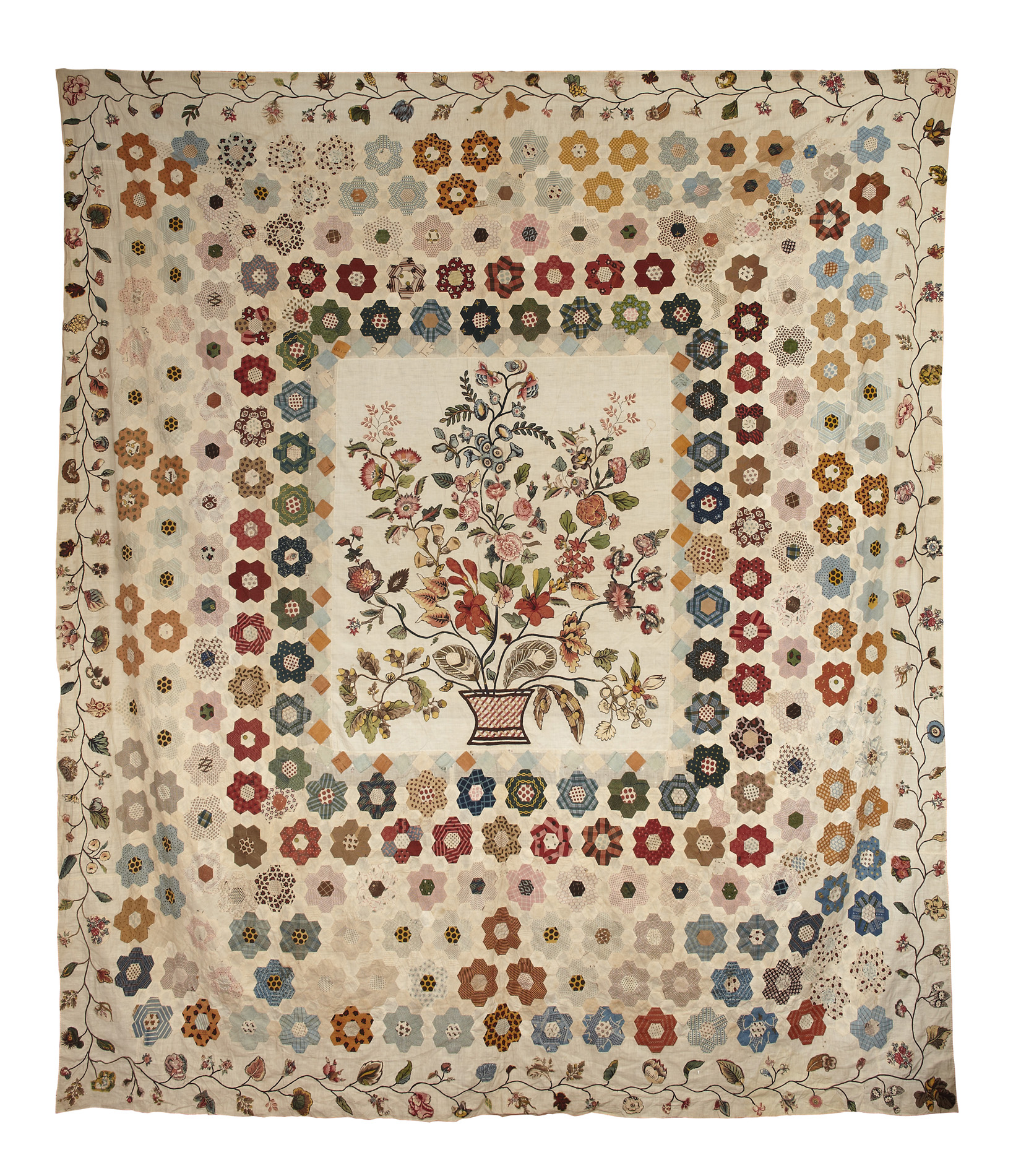 of square form, with a central panel depicting a decorative vase of flowers, amongst colourful patches on a cream ground within a foliate border