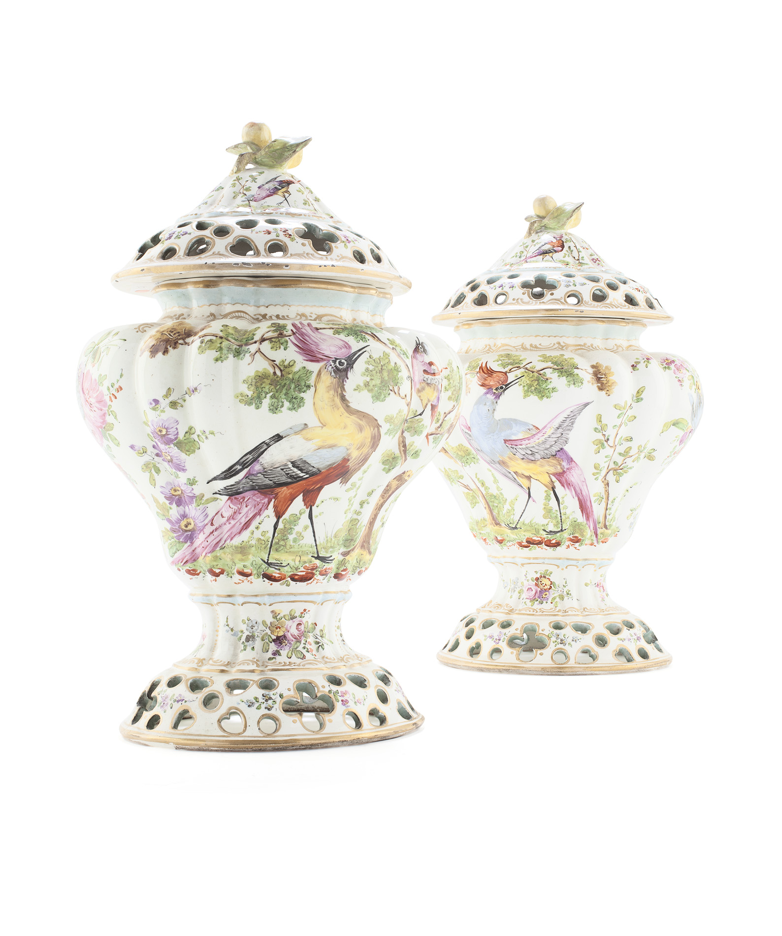 the pierced domed covers with pear finials, the fluted inverted pear form sides painted with exotic birds amongst foliage, enriched with gilt, raised on a pierced oval foot, pseudo Chelsea gold anchor marks (2)