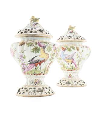 PAIR OF RETICULATED FAIENCE COVERED VASES