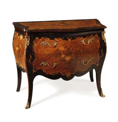 MARQUETRY AND BRASS MOUNTED BOMBE COMMODE