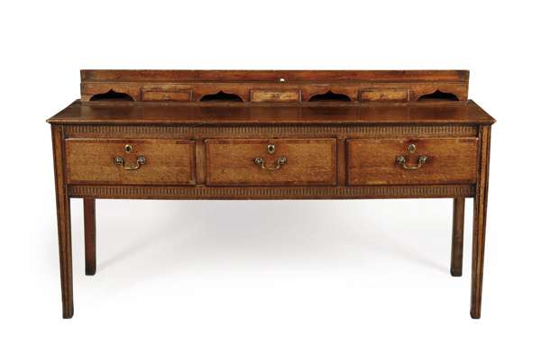the ledge back with three drawers above a rectangular top, over three frieze drawers, raised on moulded square tapering legs