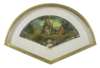 the painted leaf depicting figures within a pastoral scene, the sticks and guards decorated in the chinoserie style