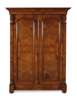 the moulded cornice above panel doors enclosing drawers and hanging space, flanked by acanthus mouldings, raised on bun feet