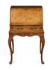 the cross banded fall flap enclosing a fitted interior above a frieze drawer, raised on moulded cabriole legs and scrolling feet