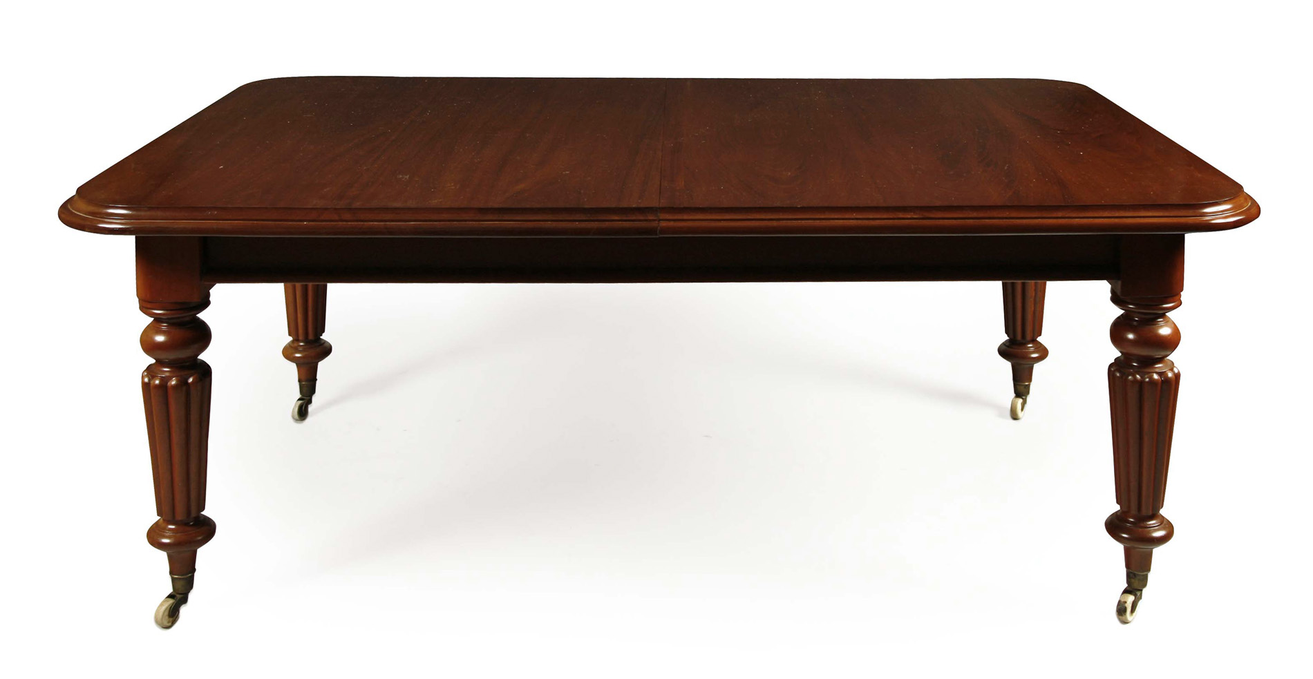 the moulded rectangular top above a plain frieze, raised on turned fluted legs and ceramic casters, including two leaf extensions
