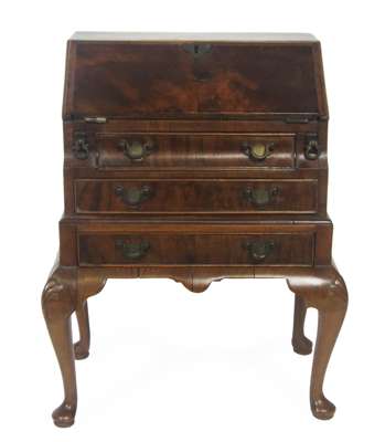 with a slant front enclosing a fitted interior, above three drawers, raised on cabriole legs, 25cm high; together with a MINIATURE SERPENTINE CHEST OF DRAWERS, with four graduated drawers flanked by reeded panels and raised on bracket feet, 19cm high (2)