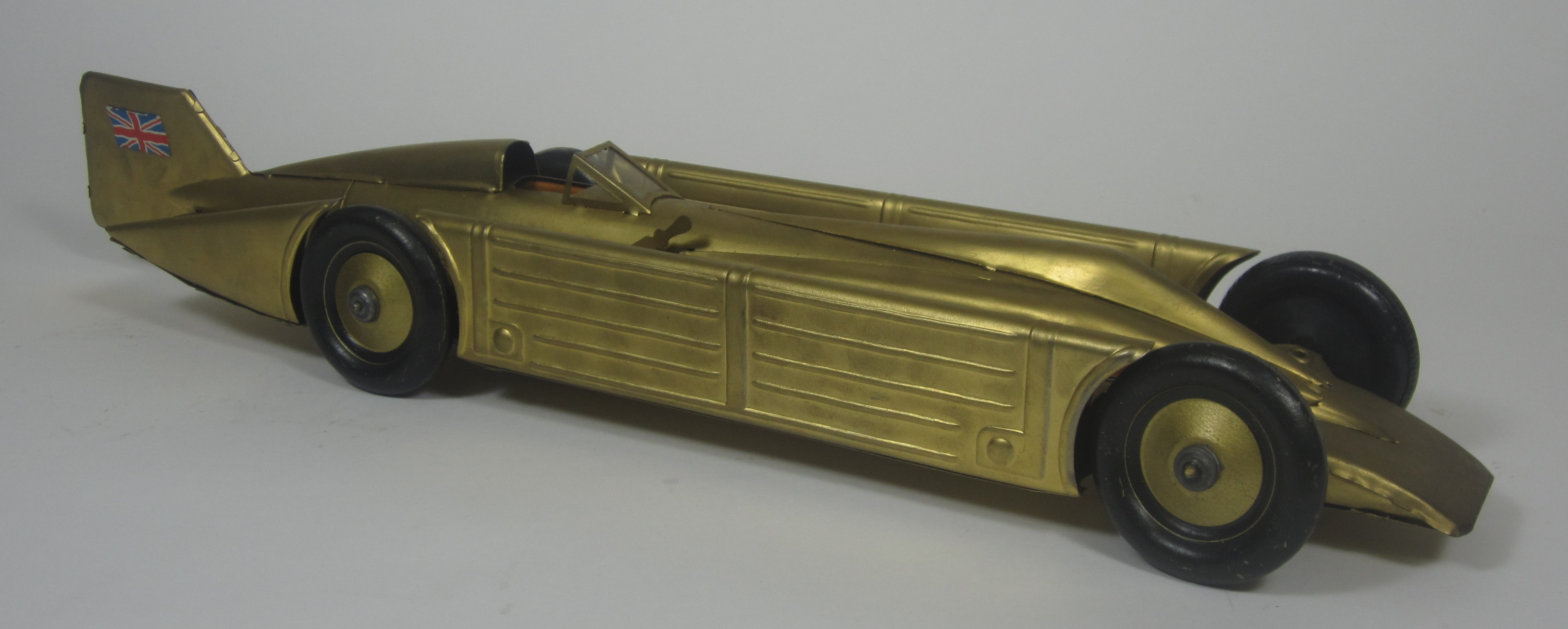 the gold and black painted metal body and wheels fitted with small plaques representing the Union Jack, with a winder