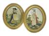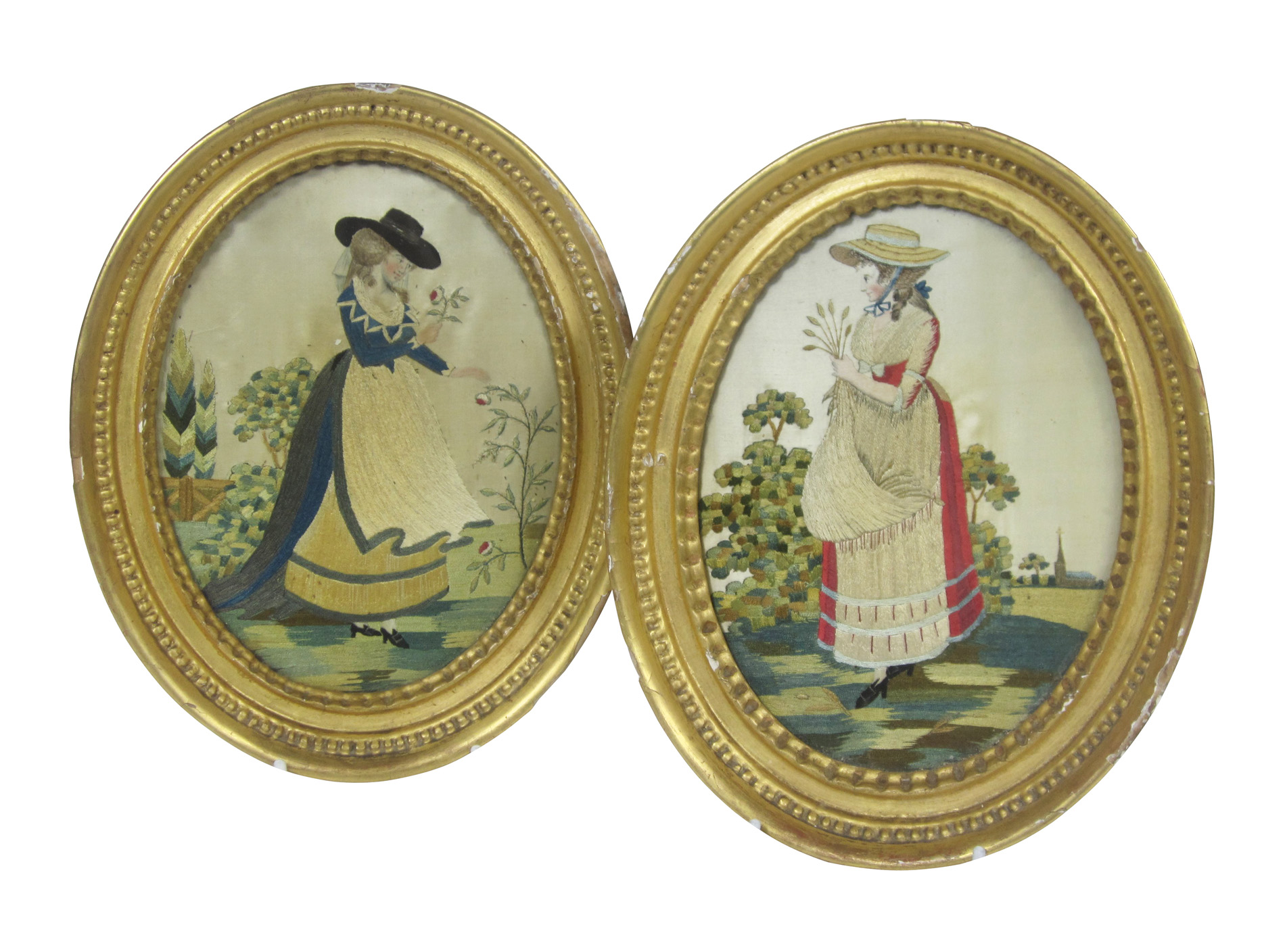 each of oval form, depicting profiles of female figures holding flowers and wheat sheaths, possibly two of the four seasons, in giltwood frames (2)