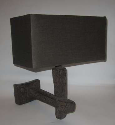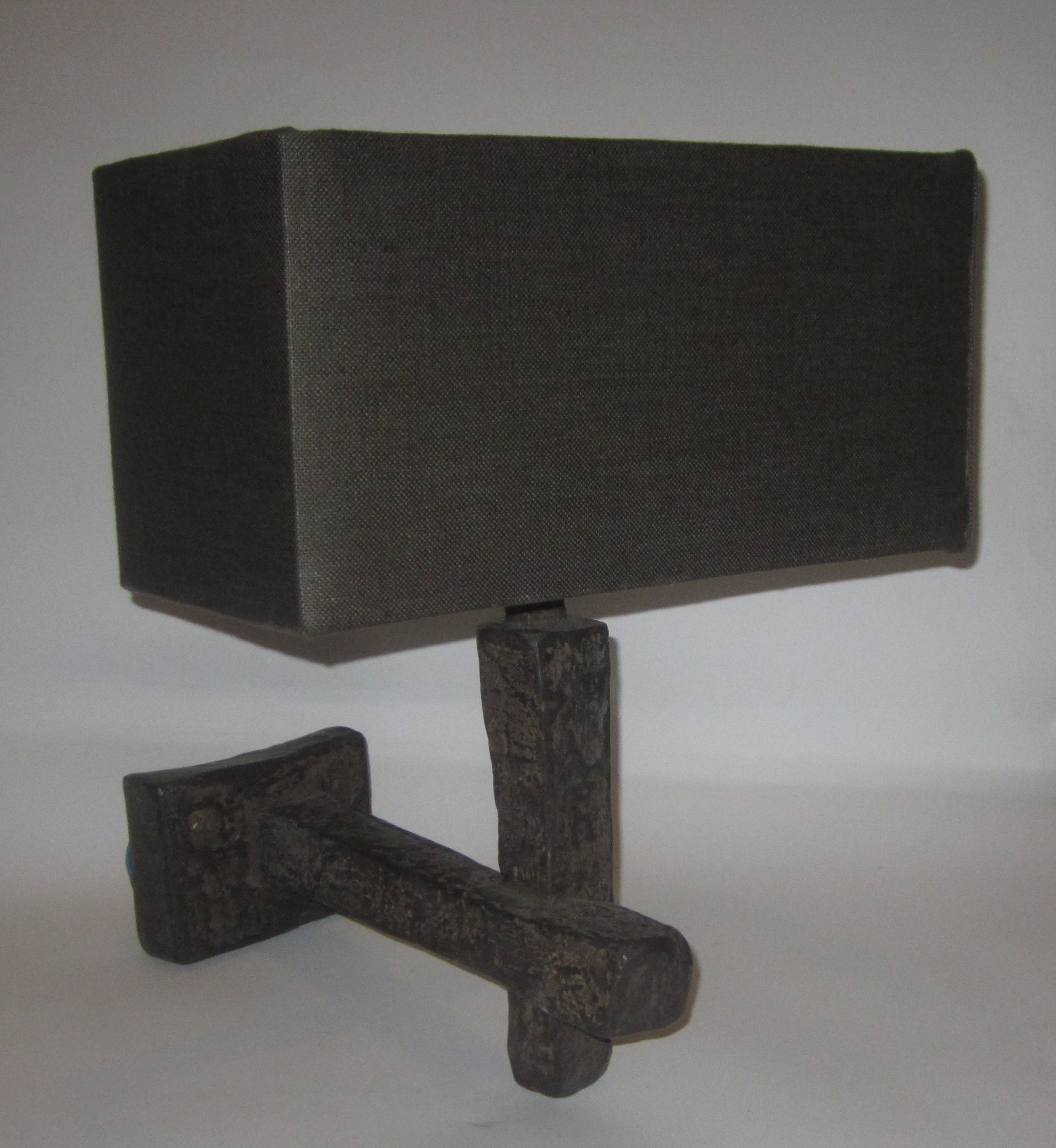 each with a horizontal arm supporting the vertical upright, with maker's mark and foundry mark, wired for electricity, with a dark grey shade (2)