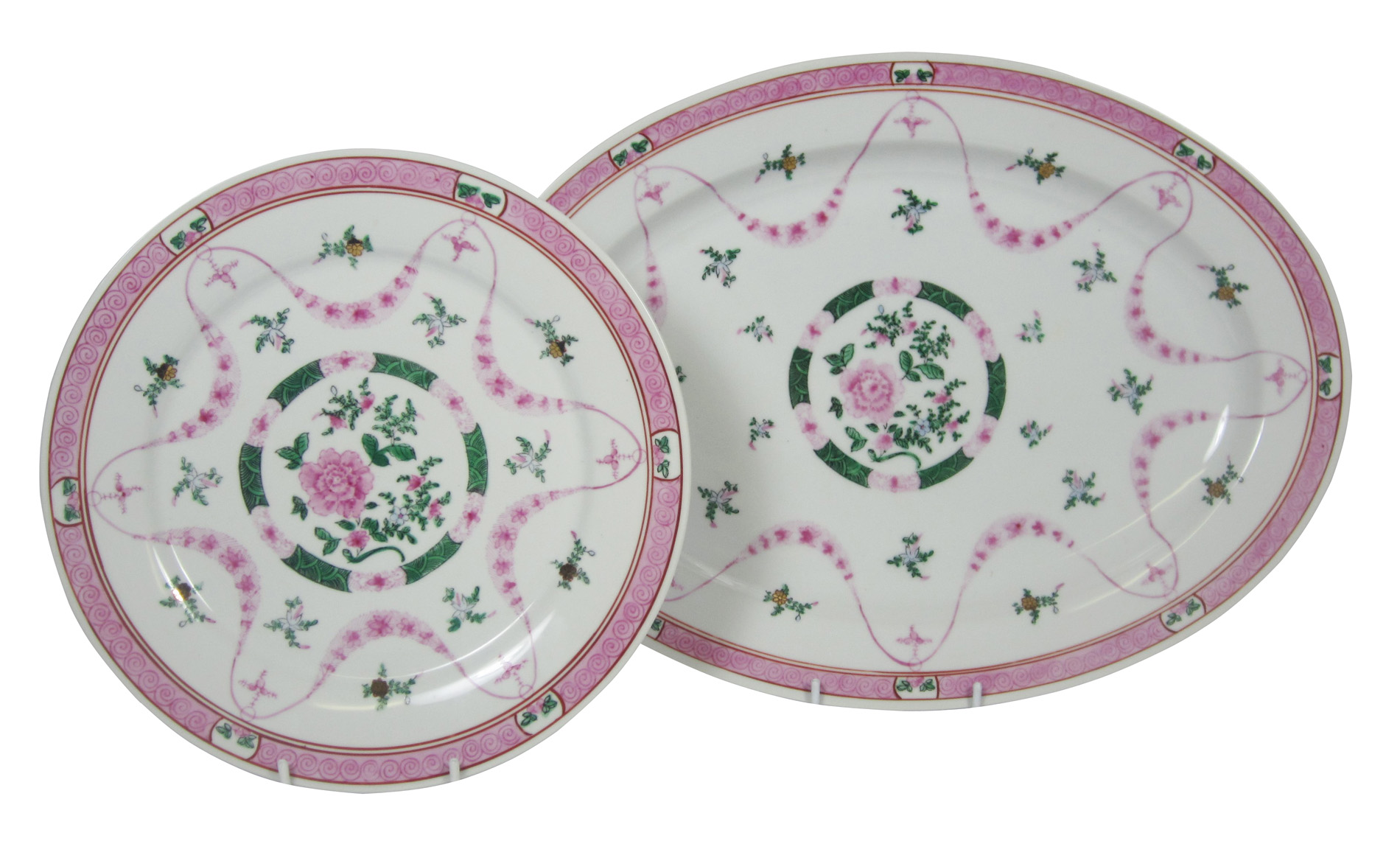 each piece decorated with pink and green motifs with flowers, variously marked 'Hong Kong' to underside, comprising of: 56 dinner plates; 15 soup dishes; 33 fish plates; 14 ashets; and 11 bowls of different sizes (qty)