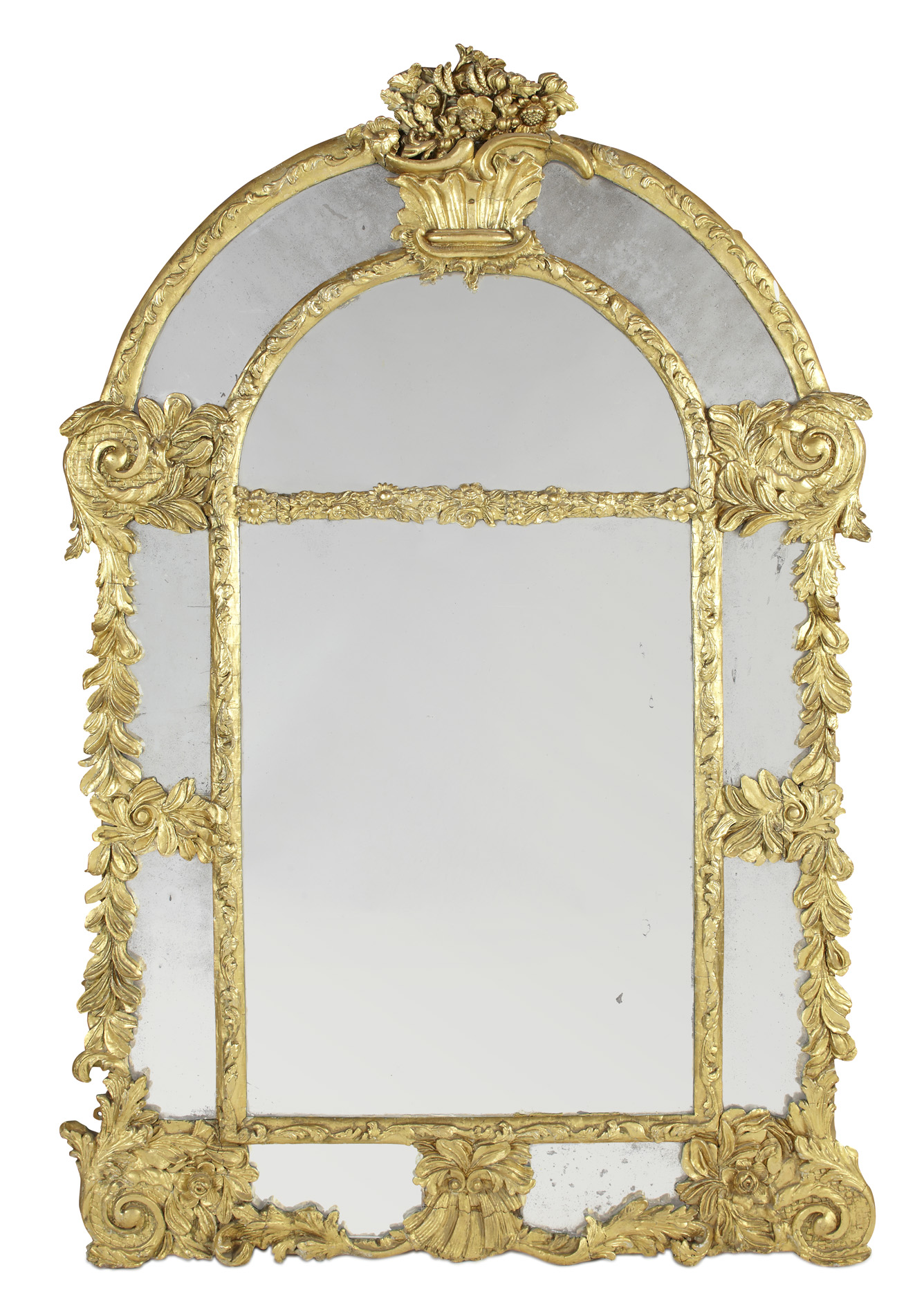 the arched divided mirror plate within a mirrored border in a foliate scroll and flower carved frame surmounted by carved flowering basket cresting