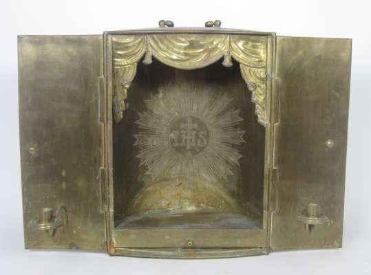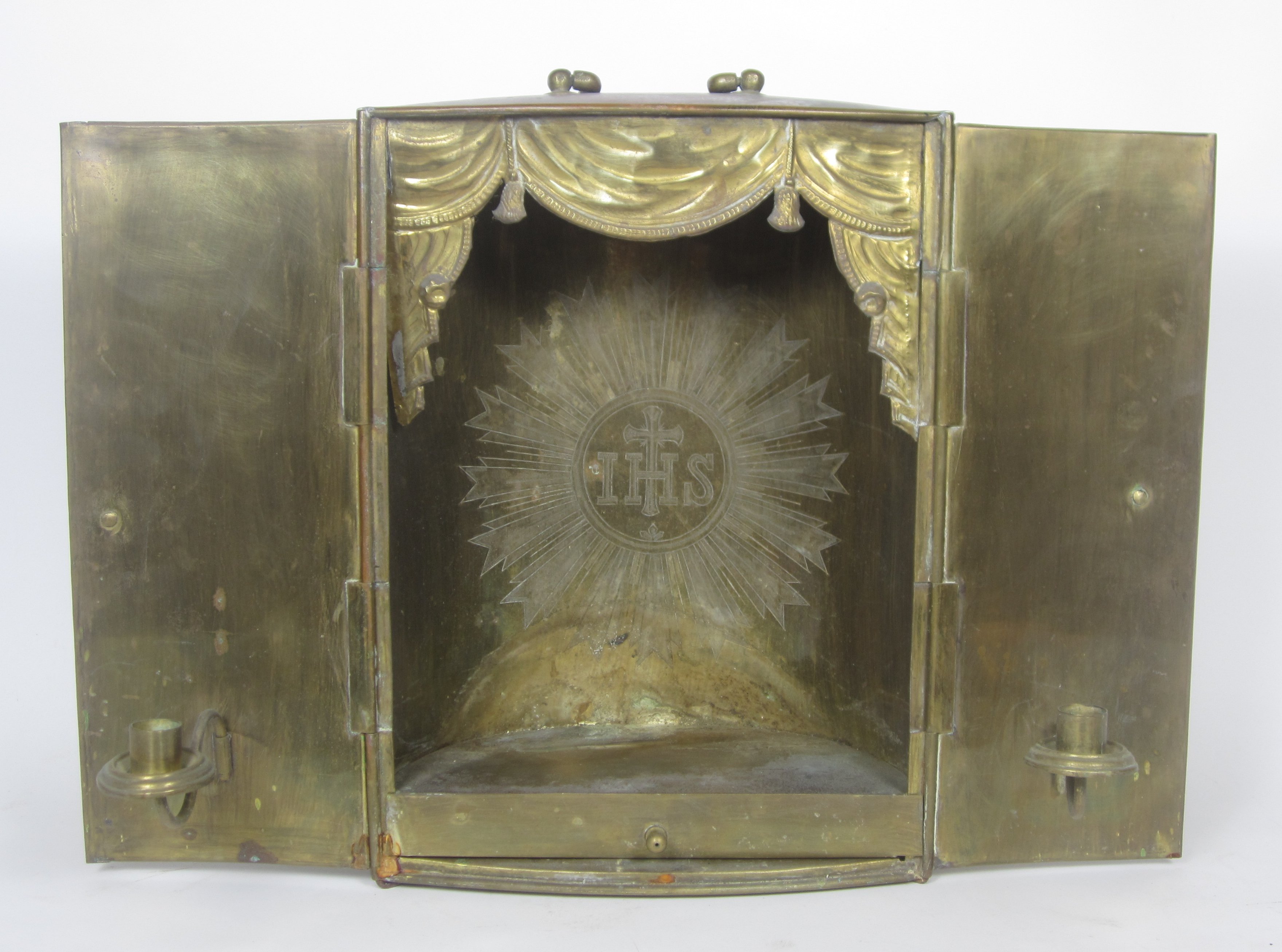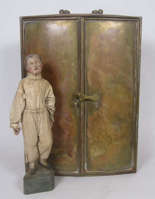 of demi lune shape, the twin doors opening to reveal religious inscriptions and two out-folding candle sconces, 37cm high; together with an associated PAINTED WOODEN FIGURE, modelled as a boy in clothing, raised on a wooden base, 26.5cm high overall (2)