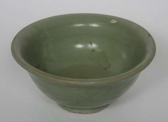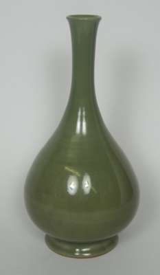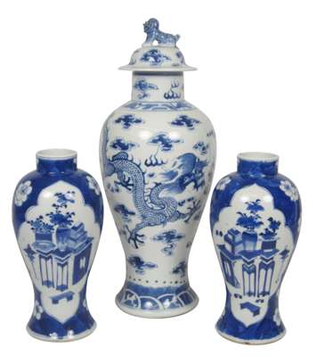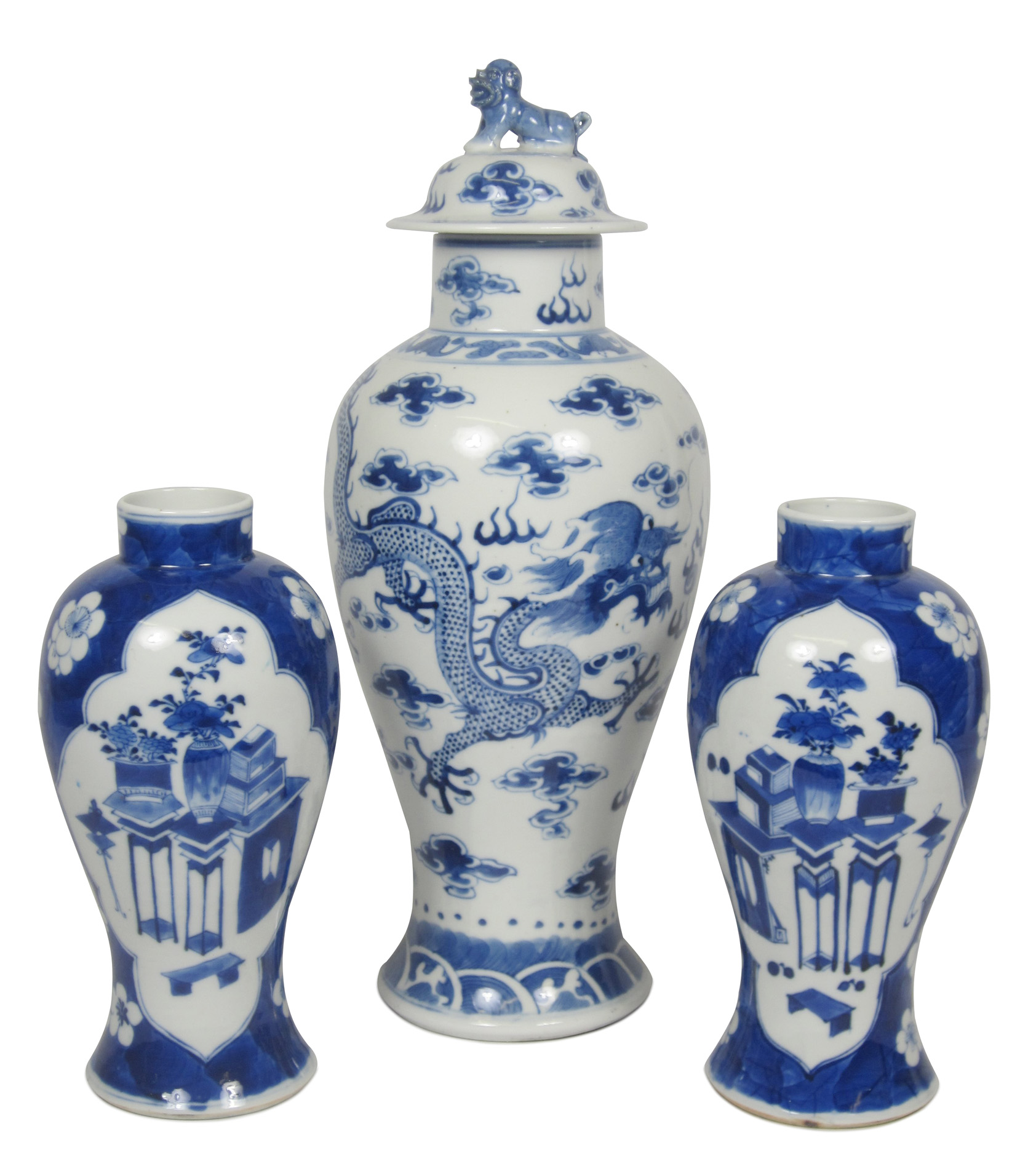 comprising of: a blue and white baluster vase and cover, with marks to underside, 37.5cm high; a pair of blue and white baluster vases (covers lacking), marks to undersides, 22cm high; a celadon bottle vase, 23cm high; and a celadon bowl, 15cm diam. (5)