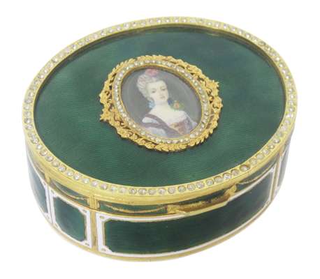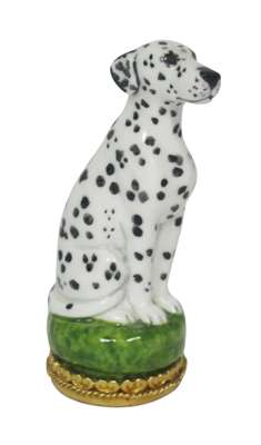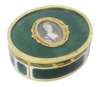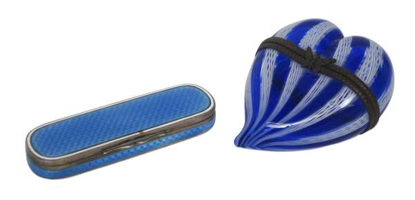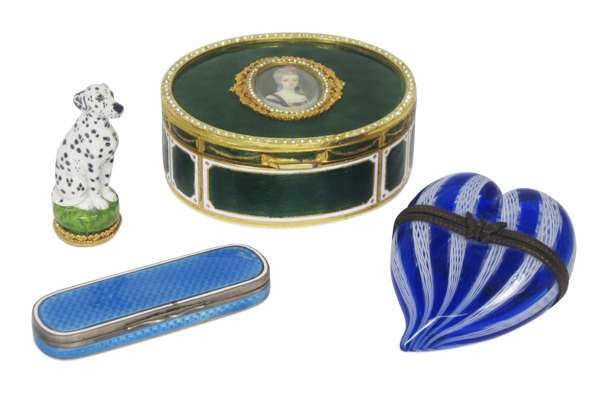 comprising of: a gilt metal and green enamelled example; a silver and gilt enamelled toothpick box; a blue and white cane glass box, shaped as a heart; a porcelain mounted white metal box; a lacquered wooden box and miniature ivory spoon; together with a PORCELAIN DALMATIAN SHAPED SEAL; and a PAINTED PORCELAIN CANE HANDLE (7)