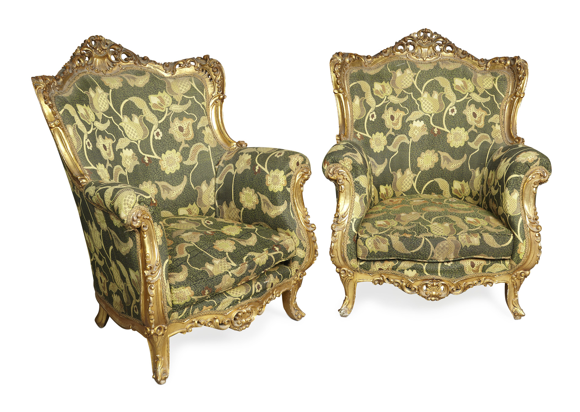PAIR OF ROCOCO STYLE GILT UPHOLSTERED ARMCHAIRS