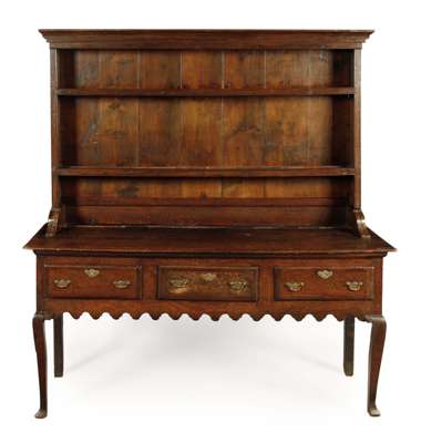 the moulded cornice above two shelves, over the base with three frieze drawers, raised on cabriole legs and pad feet