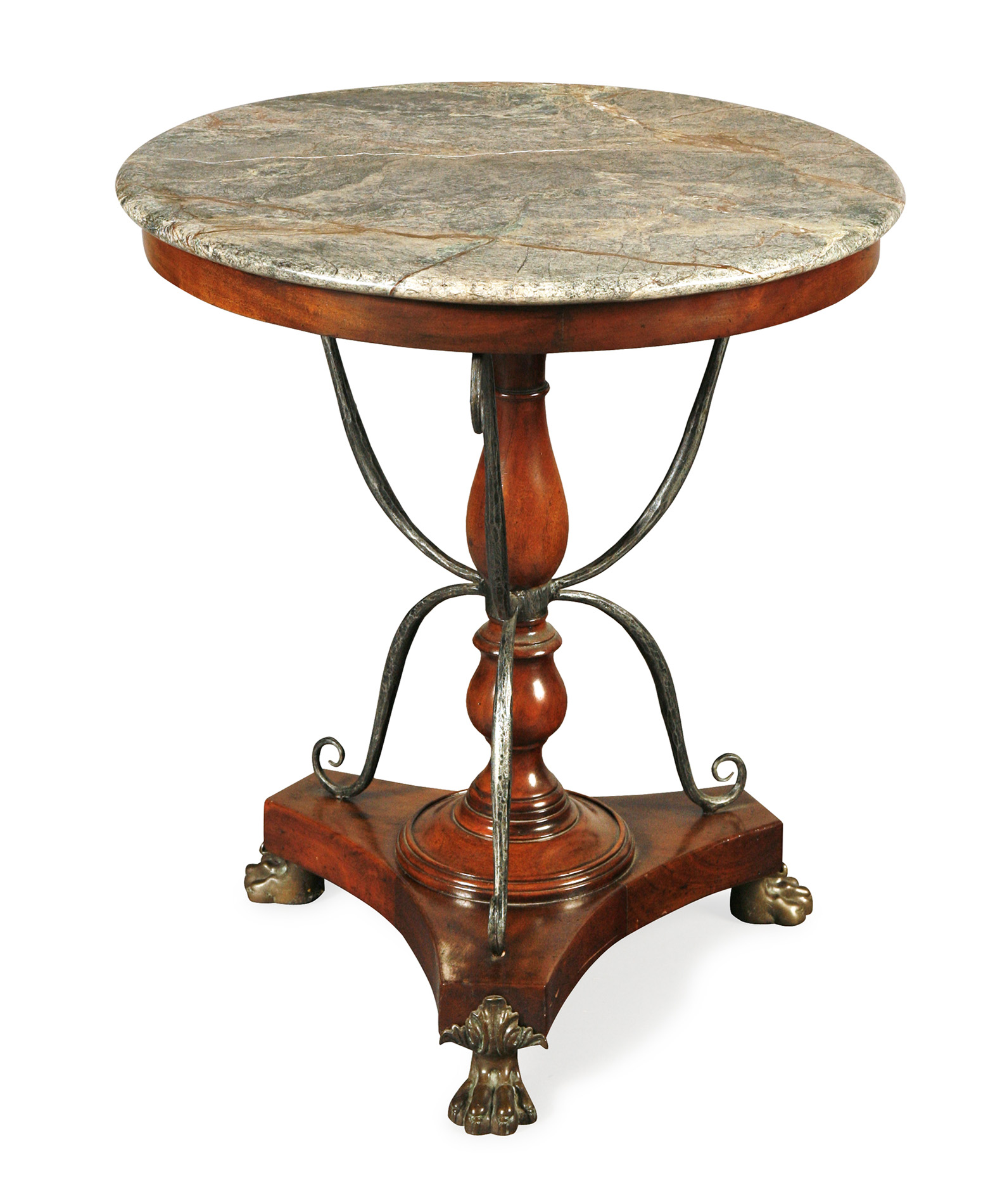 the circular top above a turned support with further scrolling metal supports, above a triform base, raised on brass lion paw feet