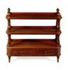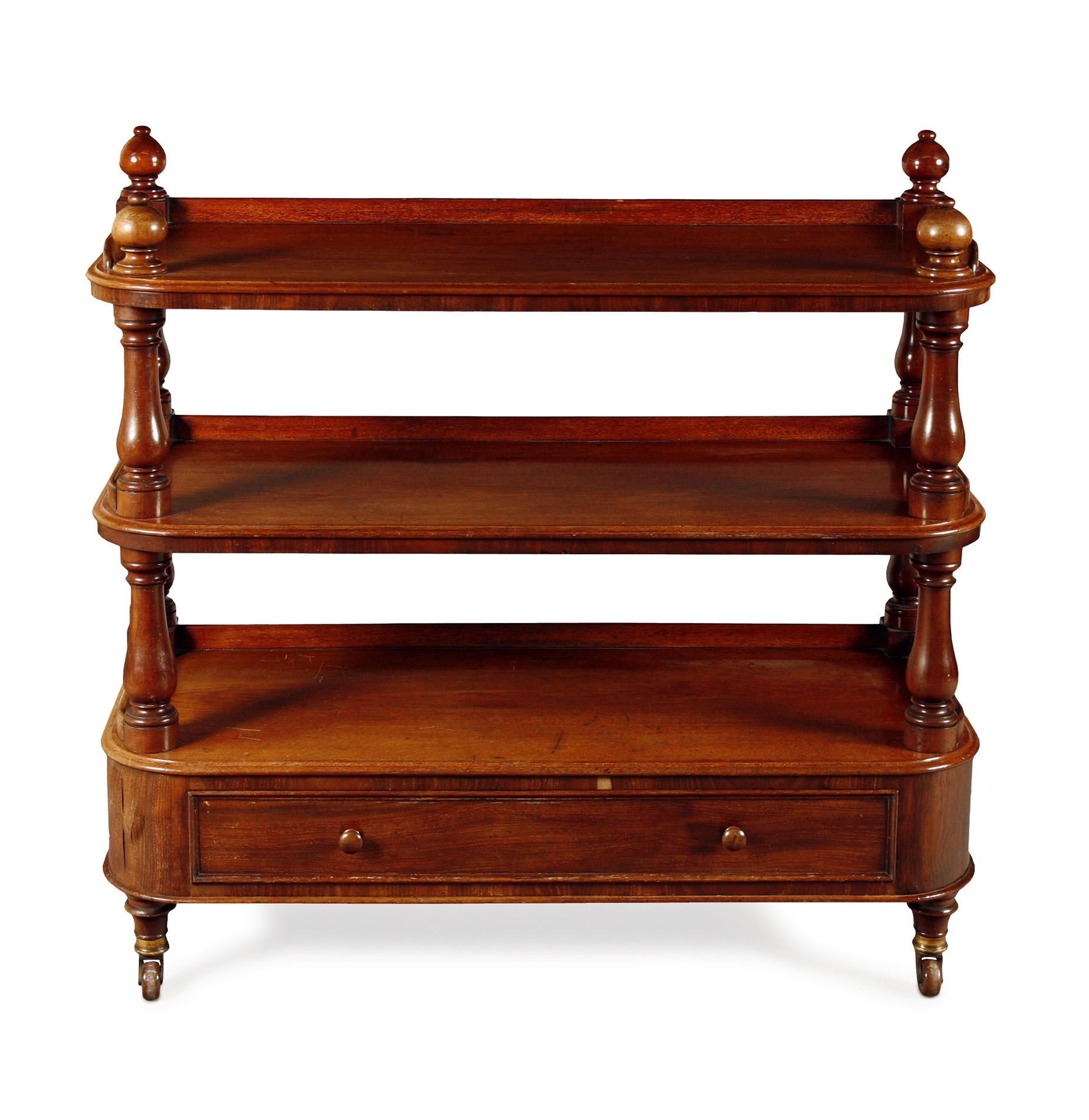 the rounded rectangular top above two further tiers, with baluster turned supports, over a long drawer, raised on brass caps and casters