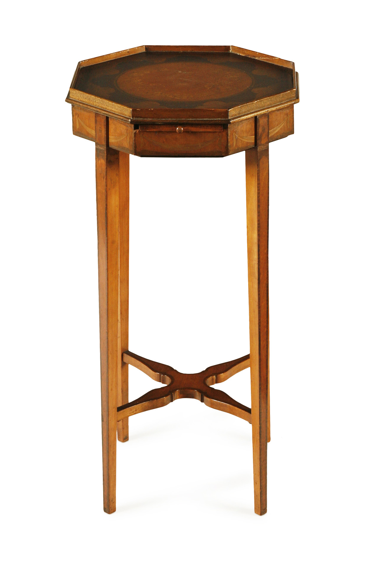 the floral painted top above a swag inlaid frieze, raised on square tapering legs united by stretchers