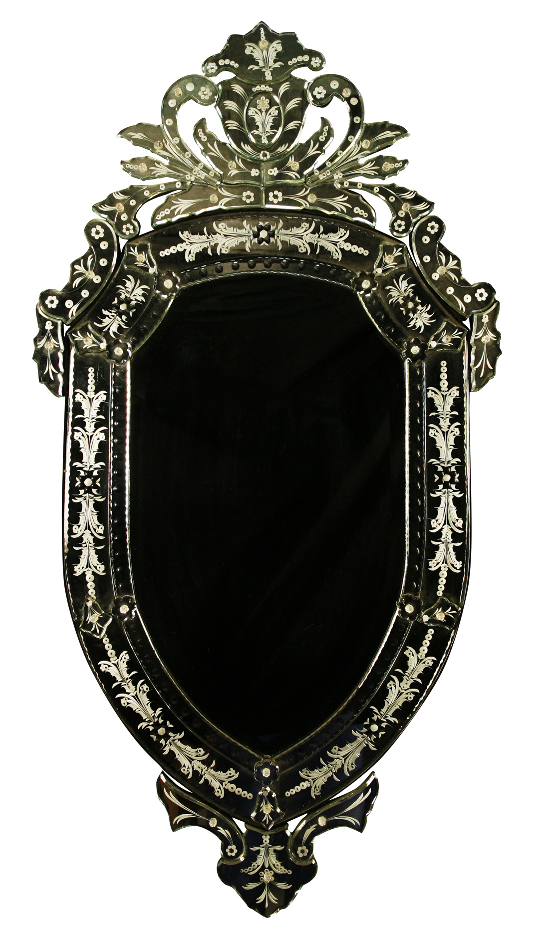 the shield shaped bevelled mirror plate within a mirrored engraved frame, surmounted by a foliate pediment