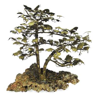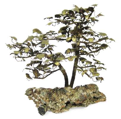 with twin trunks and spreading roots, raised on a natural stone, with maker's plaque