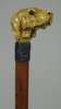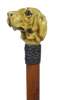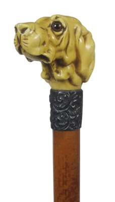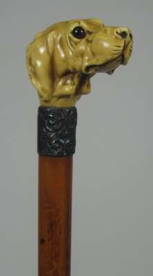 modelled as a hound with inset glass eyes, above the silver collar and tapered wooden shaft