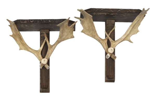 PAIR OF CARVED OAK ANTLER MOUNTED WALL BRACKETS