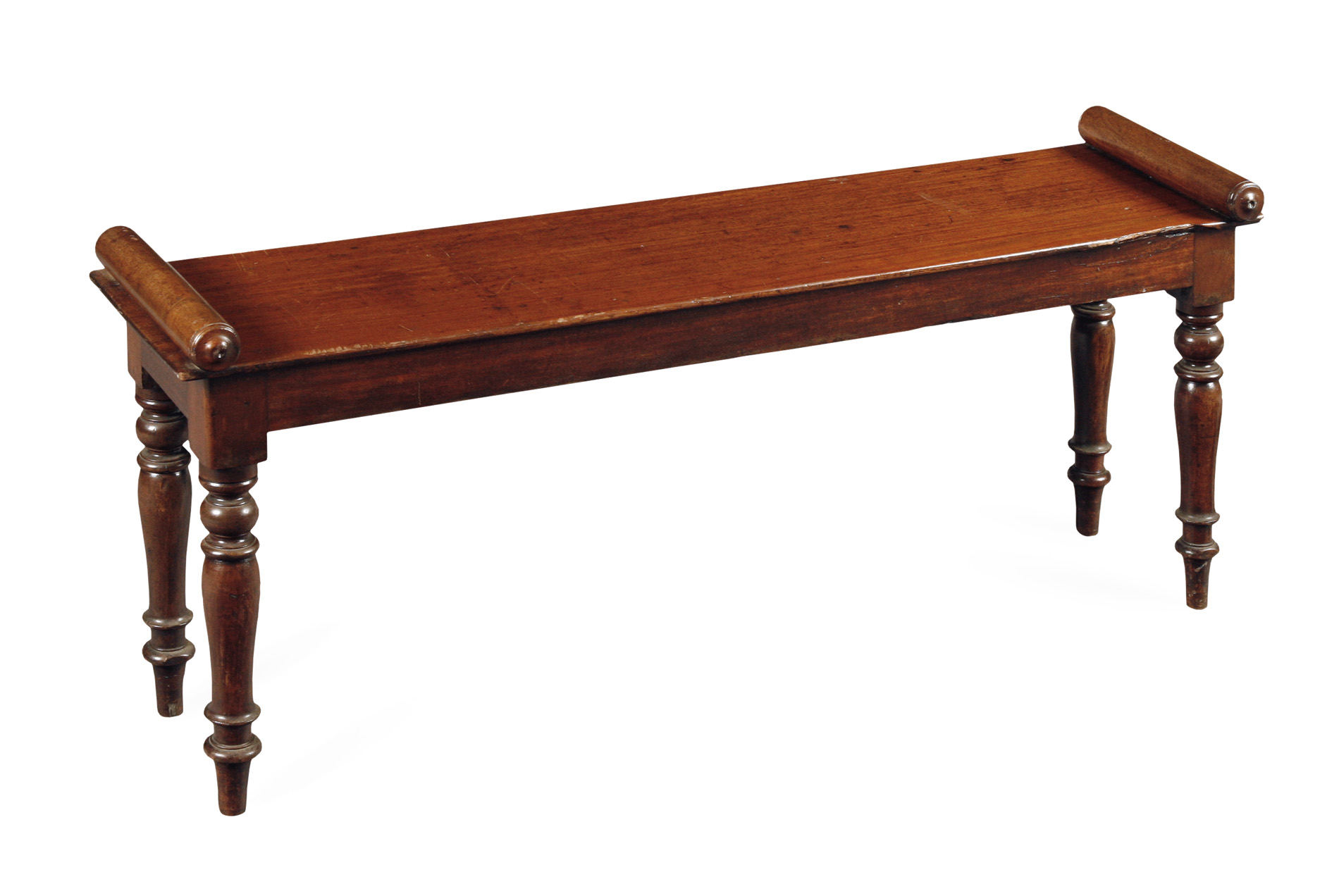 the rectangular top and turned ends above a plain frieze, raised on turned legs
