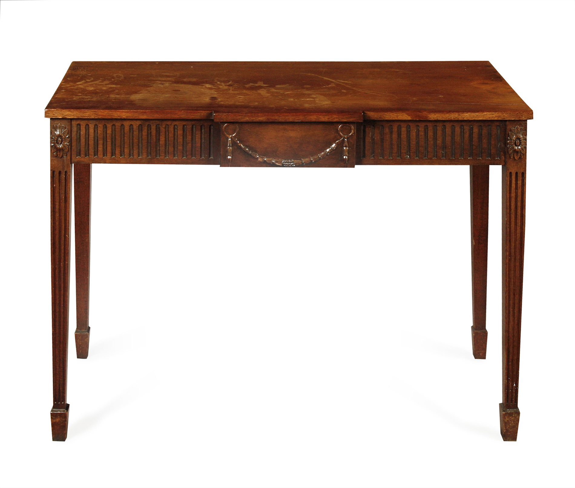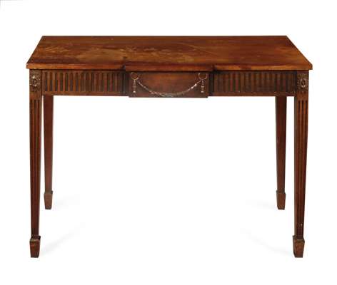 the breakfront top above a moulded frieze with a central swag, raised on fluted square tapering legs