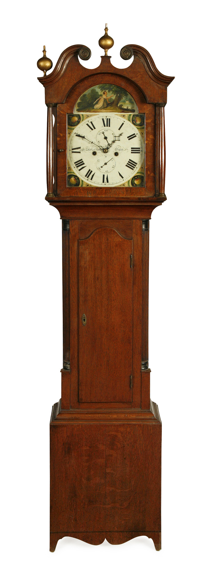 the painted arched dial with subsidiary second and date dials, within a hood with a broken swan neck pediment, flanked by turned columns, above a shaped door, flanked by reeded quarter pilasters, raised on bracket feet