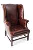 GEORGE III STYLE MAHOGANY UPLHOLSTERED WING ARMCHAIR