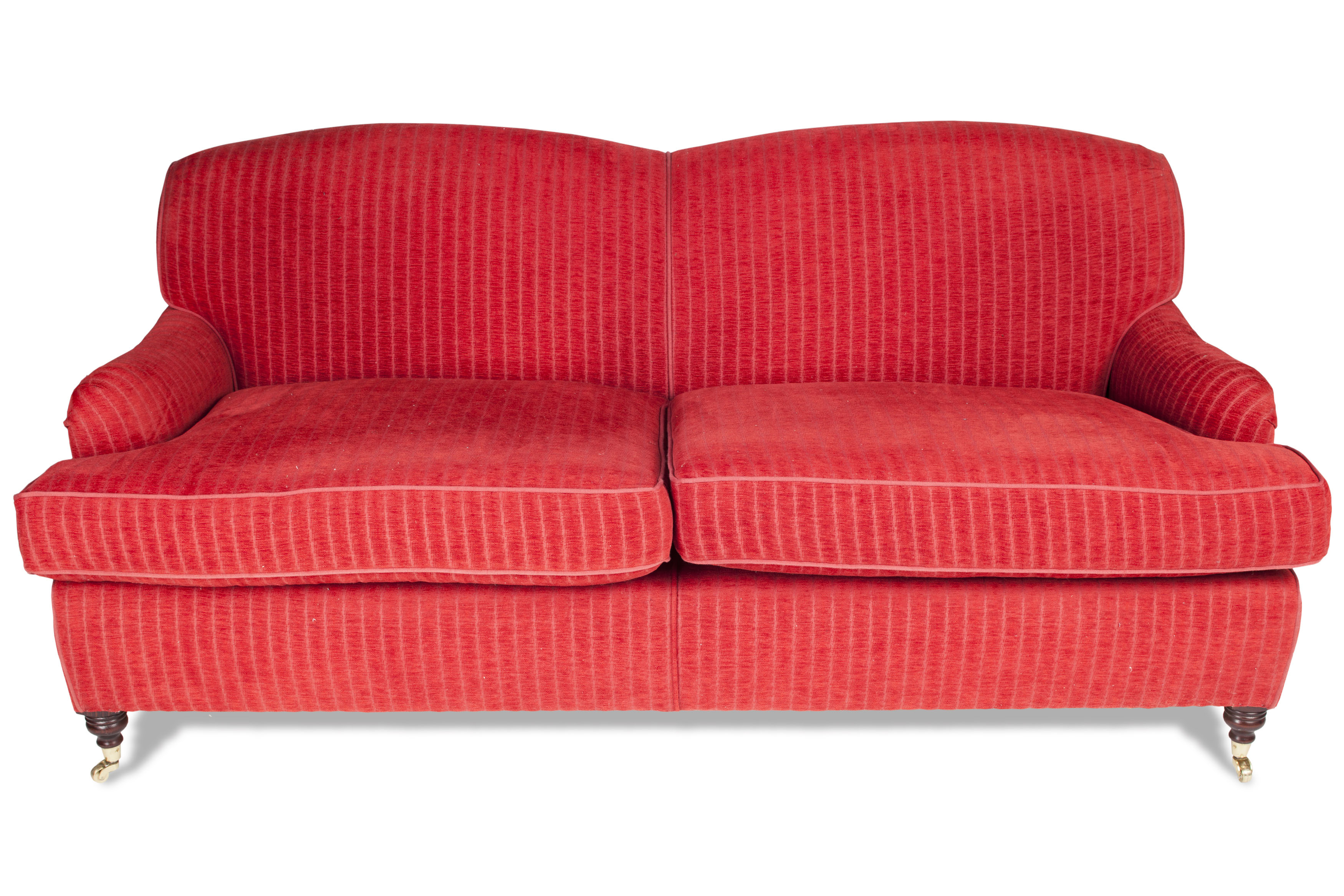 the double arched back above out scrolled arms and loose cushioned seats, raised on turned legs and brass caps and casters (2)