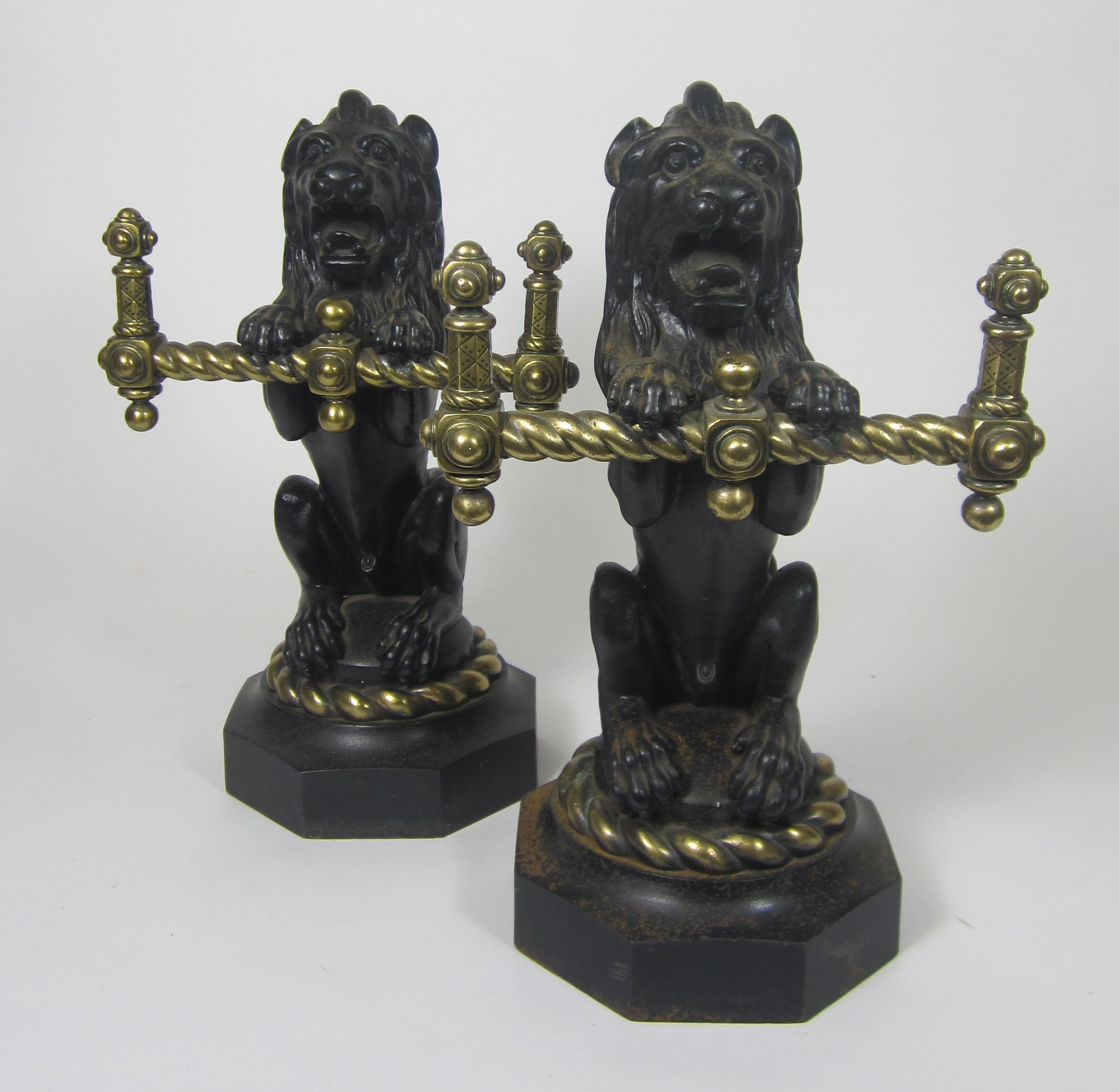 each modelled as a standing lion clutching a rope-twist brass support, 37cm high approx.; together with a SET OF FIRE IRONS, comprising a poker, shovel; and pair of tongs, with decorative brass handles, shovel 75cm long (5)