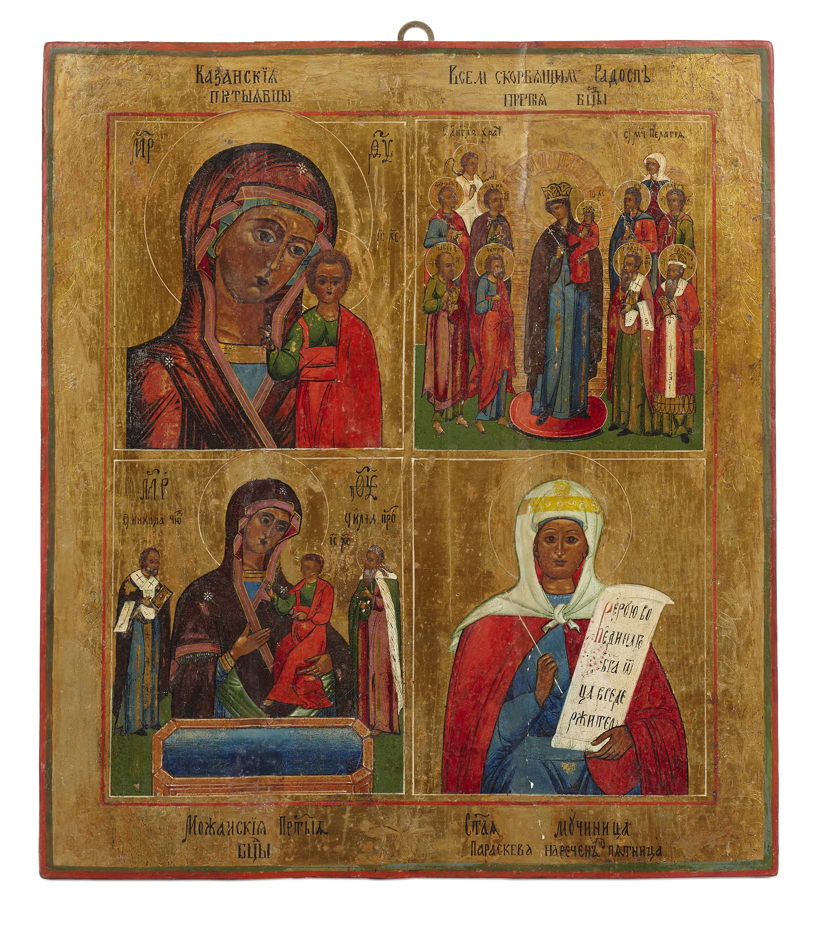 the panel divided into four equal size quadrants depicting the Mother of God of Kazan, the Mother of God of Georgia, The Mother of God Joy for all who Sorrow, and Virgin with Arrow against a gilt ground
