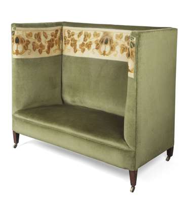 with tall back and arms and later green upholstery, with original embroidered frieze, the whole raised on square tapered legs