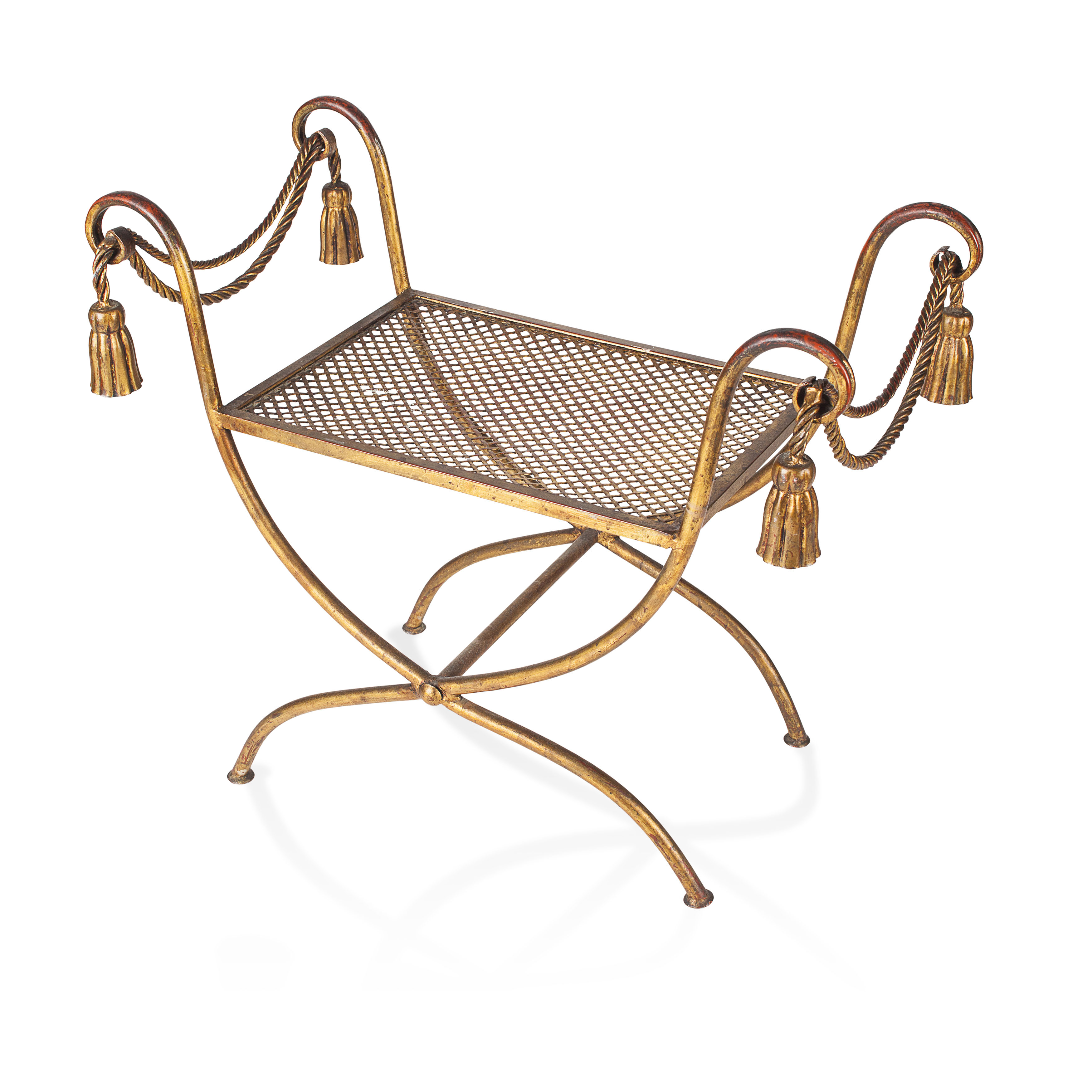 the rectangular pierced seat raised on cross framed legs, flanked by cord and tassel mouldings