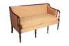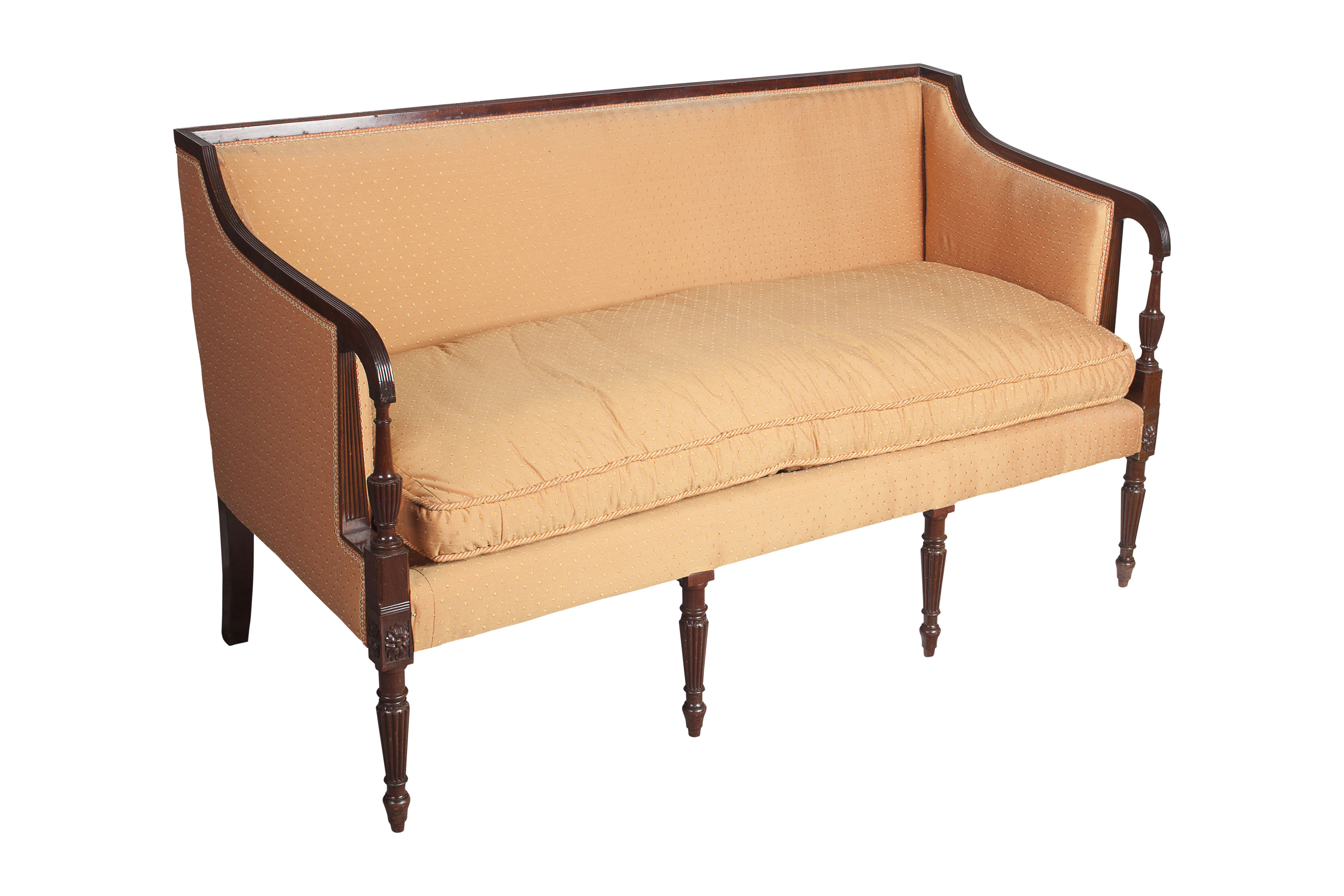 the cushioned back and down swept arms above a loose cushioned seat, raised on turned reeded legs