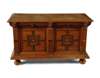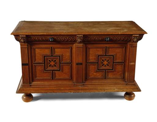 the moulded rectangular top above a carved frieze with applied masks, over a panel front, raised on bun feet
