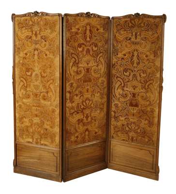 the needle point velvet panels with acanthus and vase decoration within a carved walnut frame