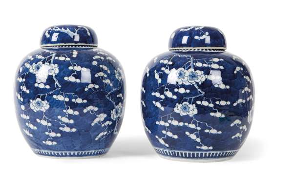 PAIR OF CHINESE BLUE AND WHITE 'PRUNUS' COVERED JARS