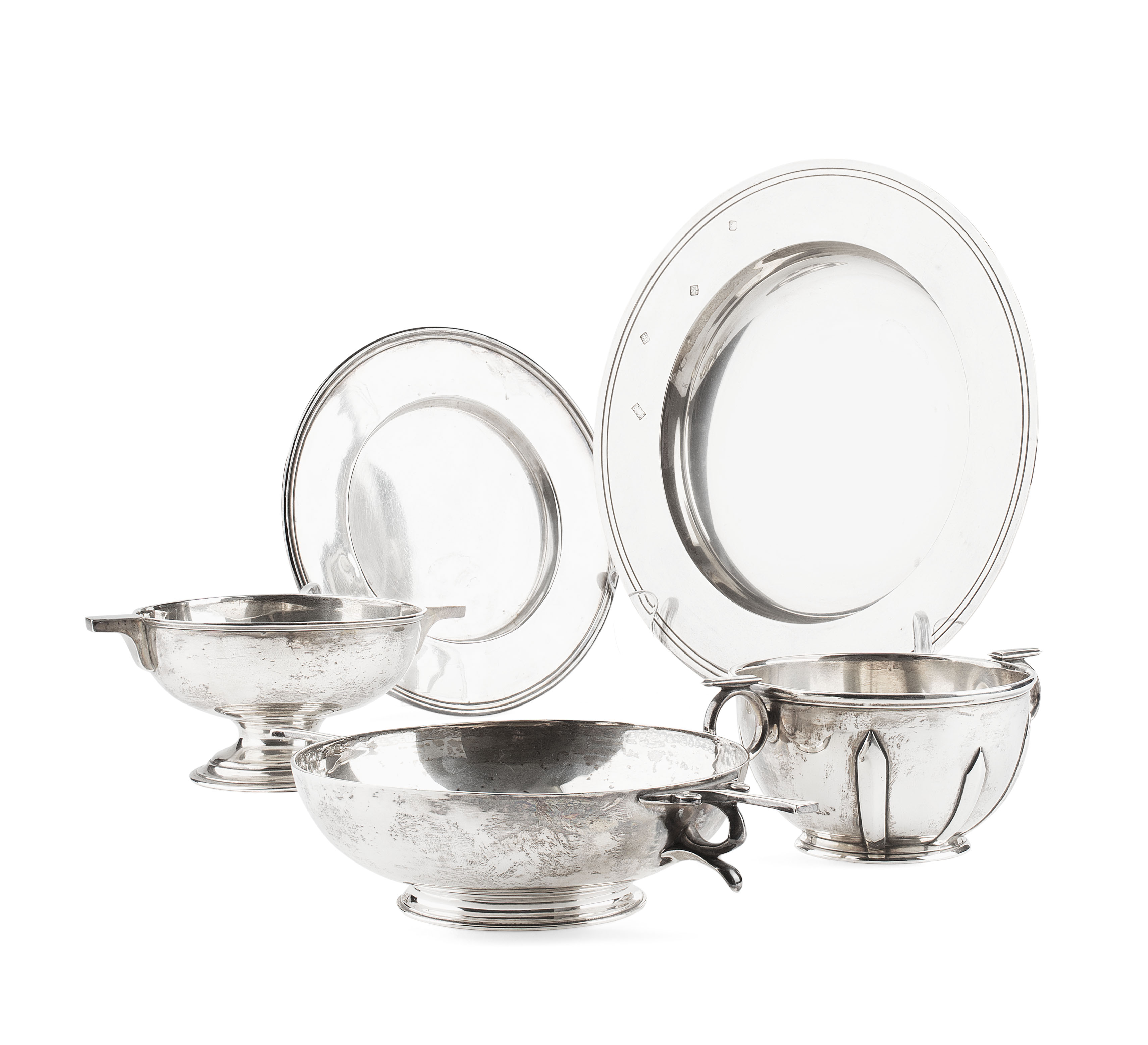 comprising of: an example with fluted decoration, marked, London 1915, 10.5cm diam.; an example marked DW JW, London 1908, 14cm diam; and a quaich marked JD & Sons, Sheffield 1931, 11cm wide; together with TWO SILVER AMADA DISHES, with feature hallmarks, 22.5cm and 17.5cm diam. (5)