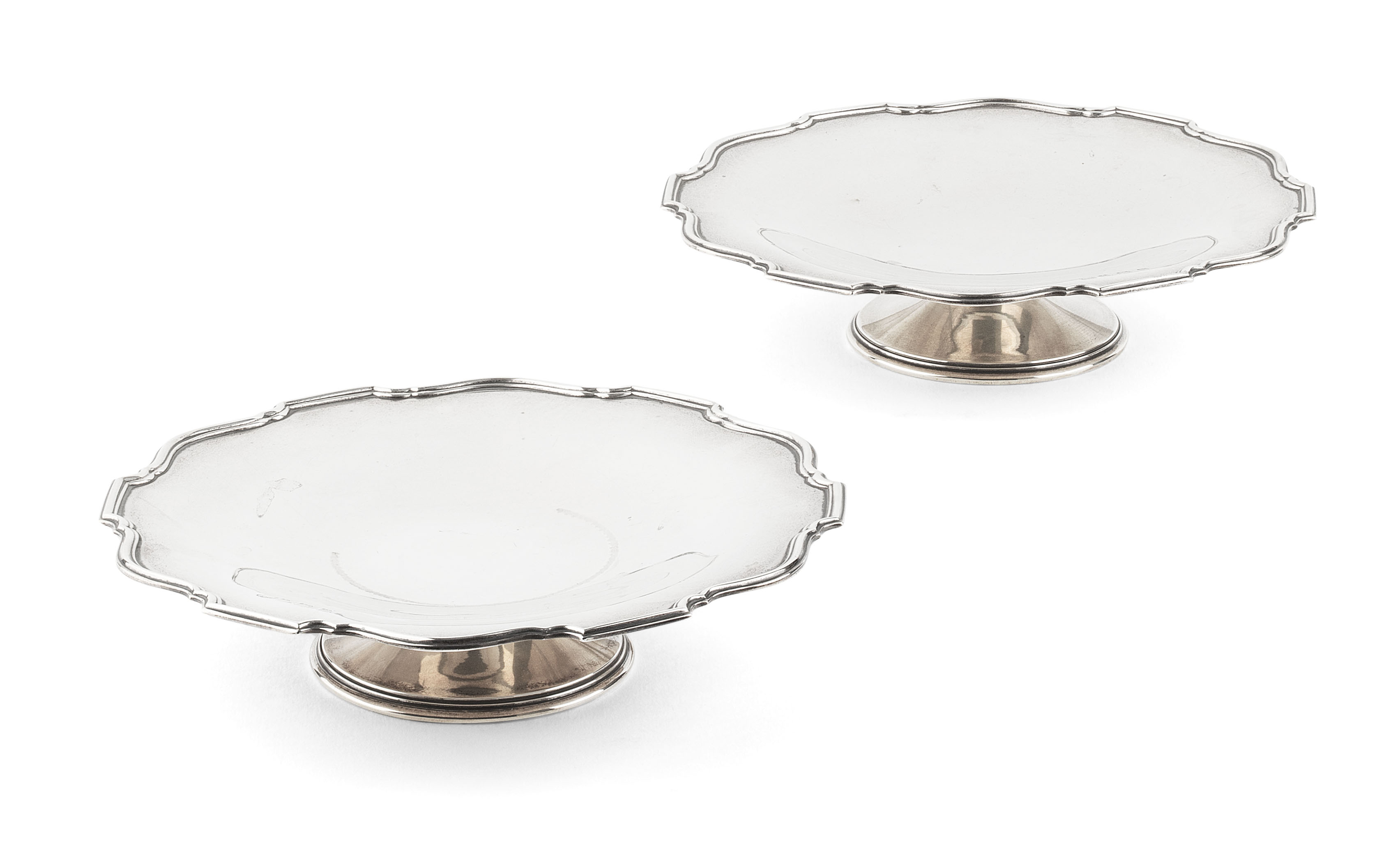 comprising: a pair with a moulded rim, marked Birmingham 1943, 18cm wide; a further pair with a shaped rim, marked Sheffield 1938, 11.5cm diam.; and a pair of silver plated dishes, 16cm diam. (6)