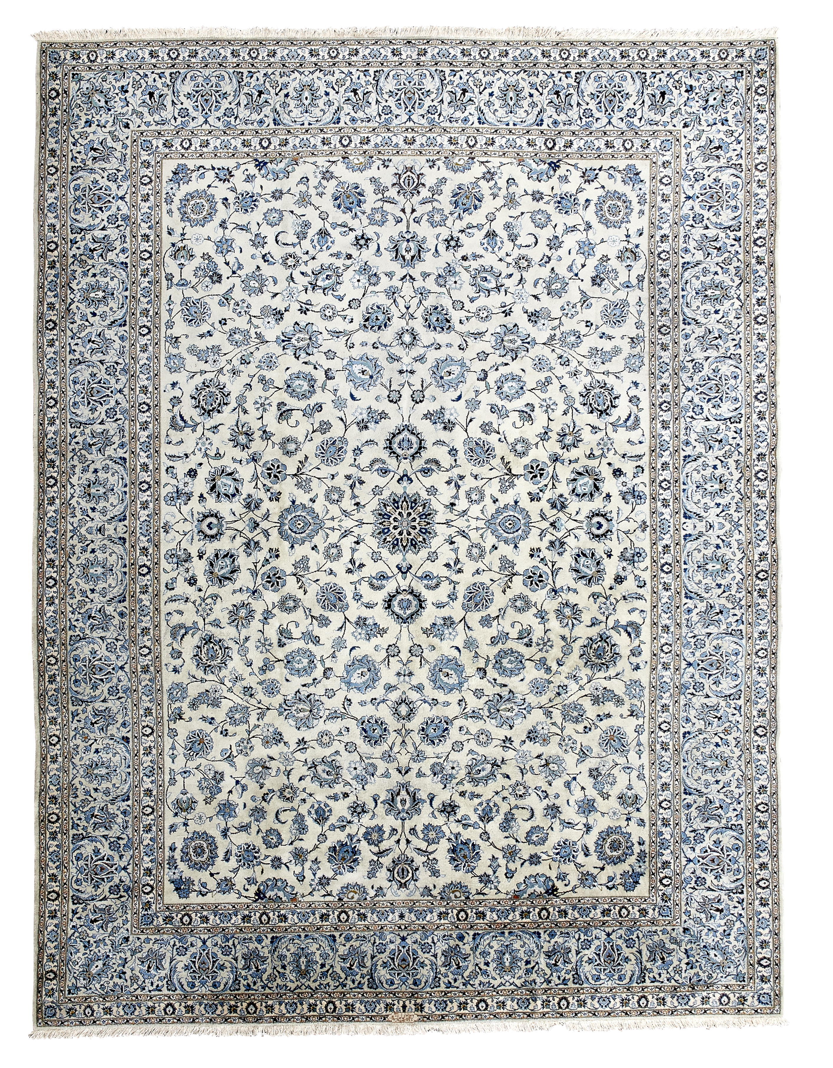 the pale blue field with allover palmette and scolling vine pattern, within similar border between bands