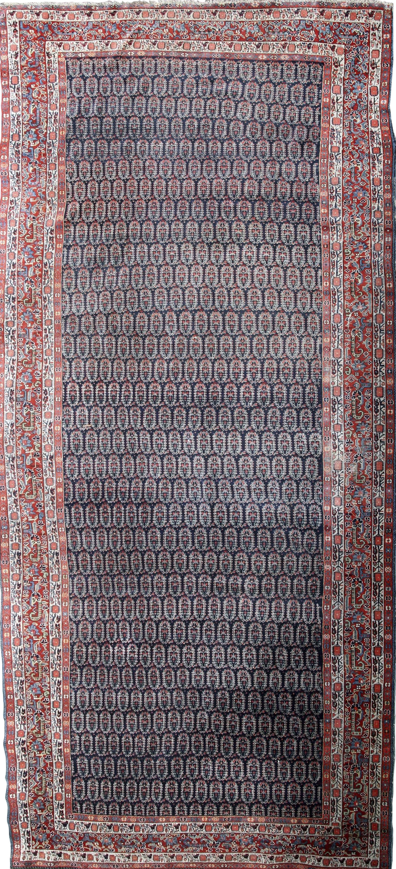the indigo field with allover boteh pattern, within red stylised foliate border between ivory and red bands