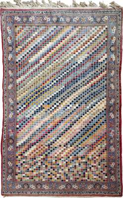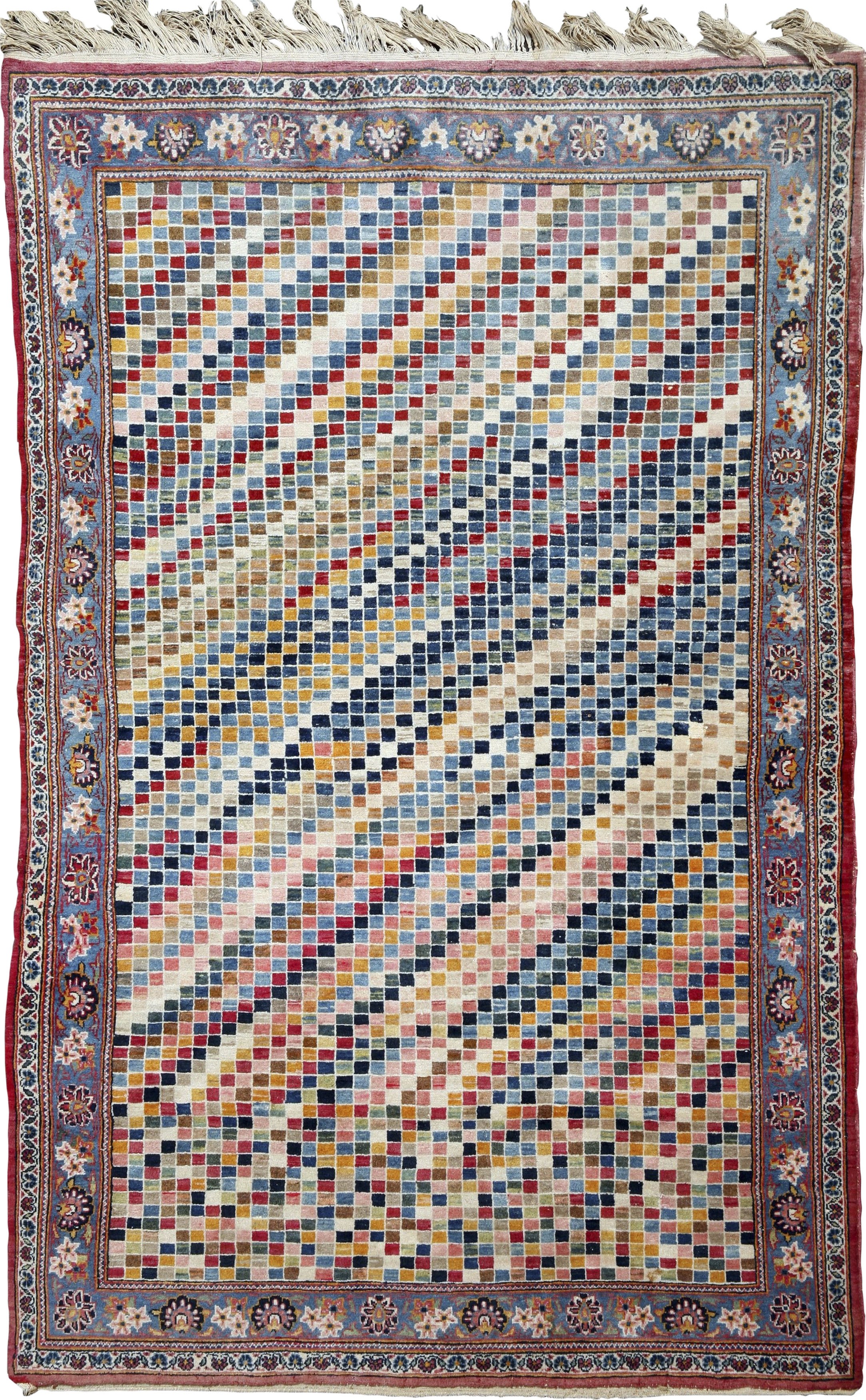 the field with allover small square polychrome lattice patern, within light blue palmette and vine border, outer band
