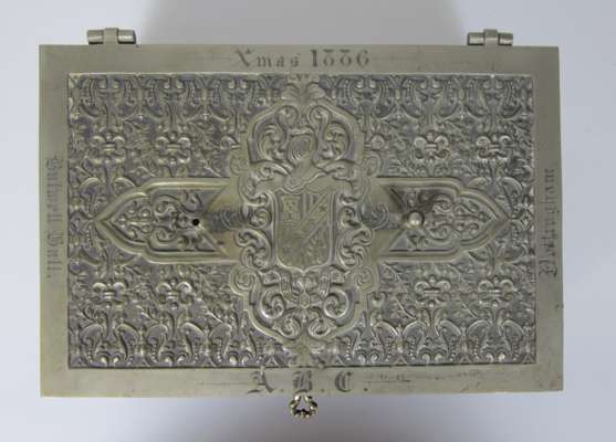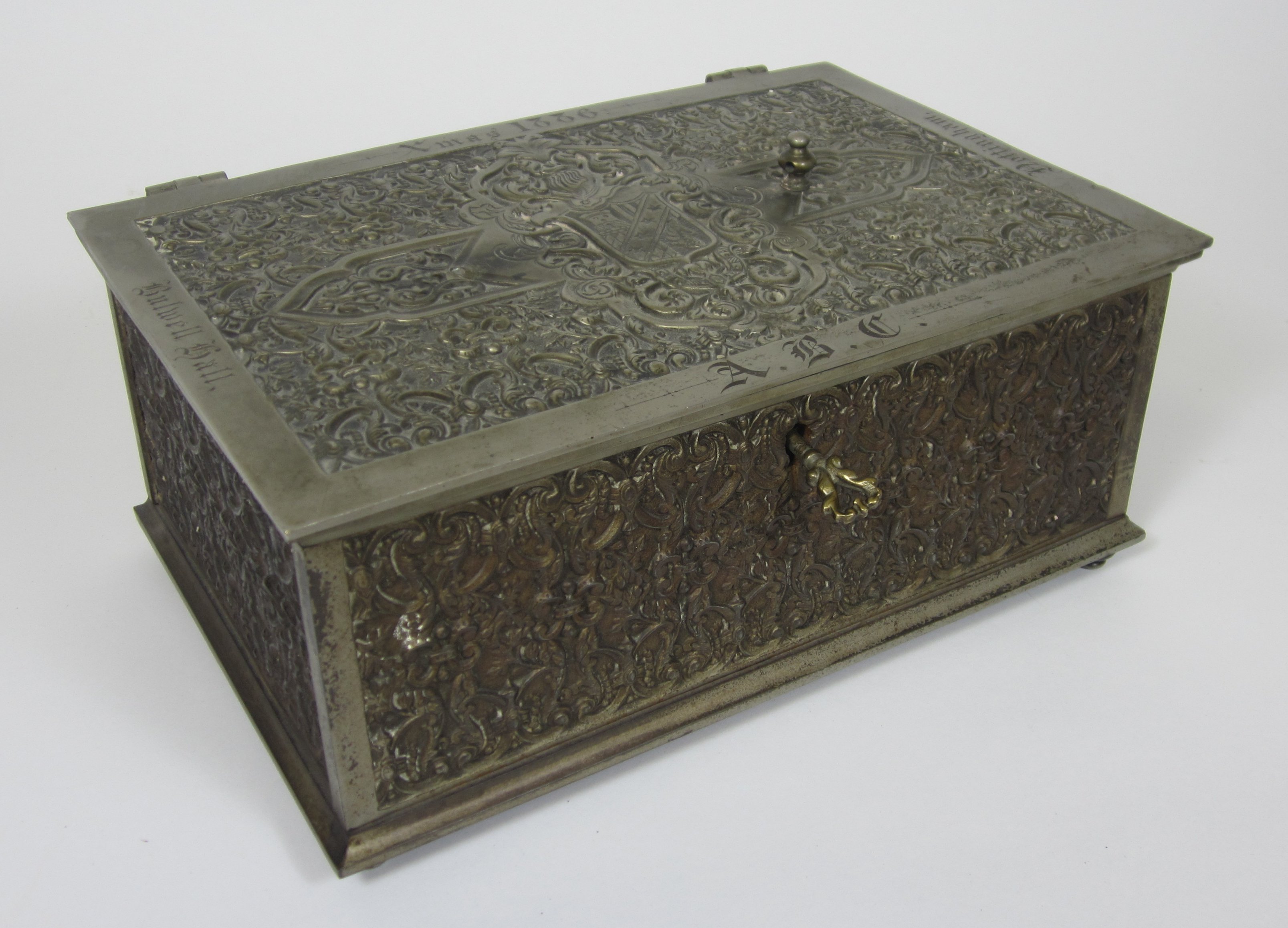 of rectangular form, the cast metal depicting scrolling leaves and a crest, inscribed to the hinged lid 'Xmas 1886, Bullwell Hall, Nottingham, A.B.C.'