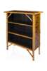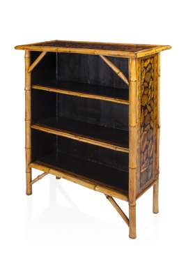 the rectangular top above three open shelves, raised on bamboo legs, with decoupage decoration depicting sea shells