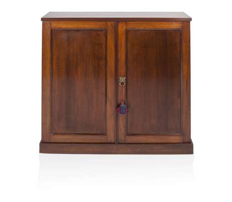 the reeded rectangular top above panel doors enclosing drawers and shelves, raised on a plinth base