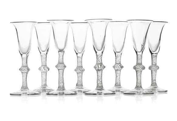 each with a fluted bowl, above the knopped opaque twist stem, with a slightly conical foot (8)
